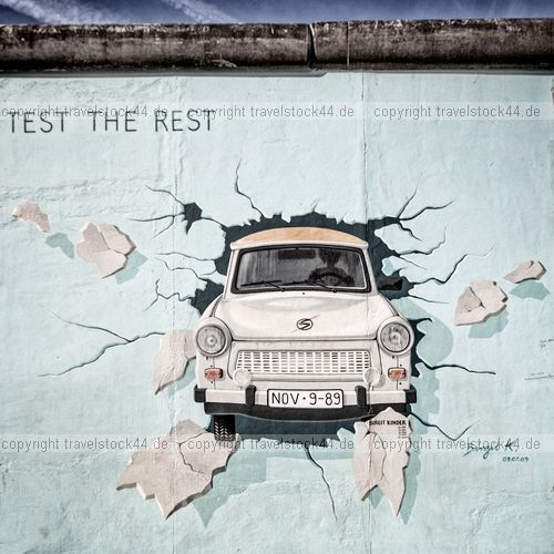 Trabant or Trabi breaking through the Berlin Wall, painting by Birgit Kinder, East Side Gallery, Friedrichshain district, Wall mural, East Side Gallery, Berlin, Germany |