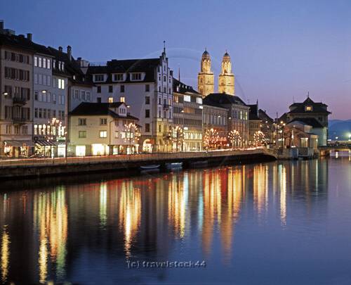 (c) travelstock44_editing, Grossmuenster, Limmat, Limmatquai, Munsterbridge, Panorama, Reise, Schweiz, Stadt, Suisse, Switzerland, Tourismus, Winter, X-mas, Z?rich, Zuerich, Zurich, bridge, bridges, cathedral, christmas, church, city, refelction, river, spires, tourism, tower, twilight, water |