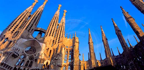 spain,Barcelona,Sagrada Famlia by Antoni Gaudi,pinacles,panorama,blue sky, | Barcelona Sagrada Familia Kirchturmspitzen |