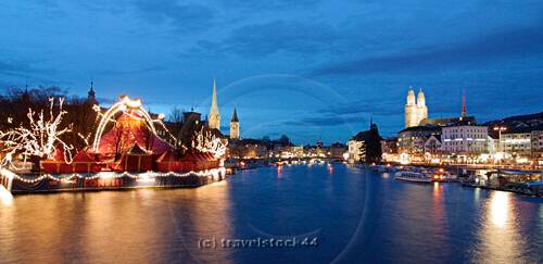 Photo: Switzerland, Zurich, River Limmat, Grossmunster, twilight, panor panorama-gallery |