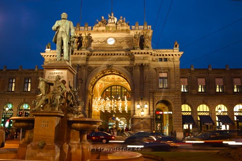 Switzerland, Zurich, railway station at twilight Portal towards the Bahnhofstrasse , Alfred Escher statue |