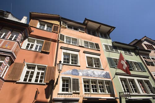 Switzerland Zurich, Augustinergasse, old city center, swiss flaggs |